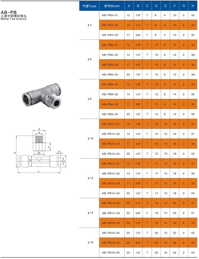 不锈钢螺纹快插三通PB的主要规格有:PB4-01,PB4-02,PB6-01,PB6-02,PB6-03,PB6-04,PB8-01,PB8-02,PB8-03,PB8-04,PB10-01,PB10-02,PB10-03,PB10-04 ,PB12-01,PB12-02,PB12-03。PB12-04,PB14-02,PB14-03,PB14-04,PB16-02,PB16-03,PB16-04等