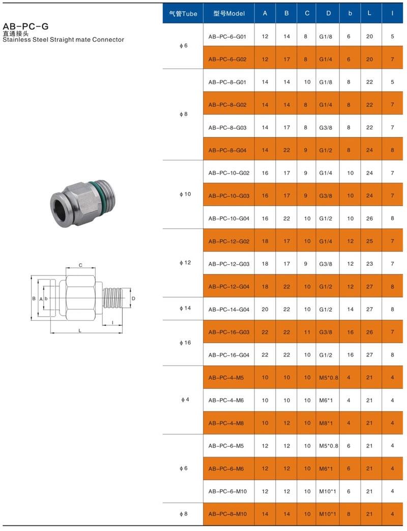 不锈钢快插直螺纹终端接头PC-G的主要规格有:PC4-G01,PC4-G02,PC6-G01,PC6-G02,PC6-G03,PC6-G04,PC8-G01,PC8-G02,PC8-G03,PC8-G04,PC8-G06,PC10-G01,PC10-G02,PC10-G03,PC10-G04,PC10-G06,PC12-G01,PC12-G02,PC12-G03,PC12-G04,PC12-G06,PC14-G02,PC14-G03,PC14-G04,PC16-G02,PC16-G03,PC16-G04,PC16-G06等