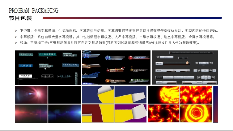 节目包装:下游键:字幕通道,供添加角标、字幕等信号使用。字幕通道可链接到任意切换通道或任意媒体类别,实现内容的快速更改。