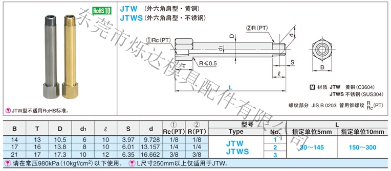• 规格:黄铜快速接头内外牙JTW不锈钢内外牙JTWS系列