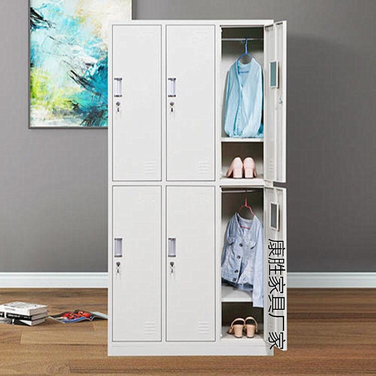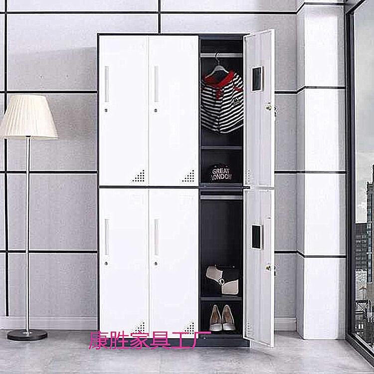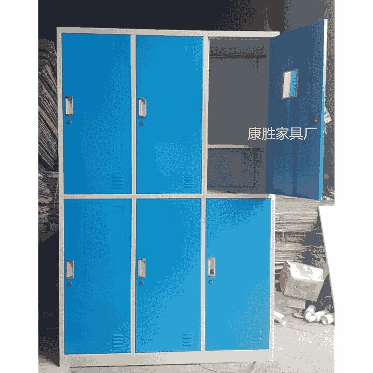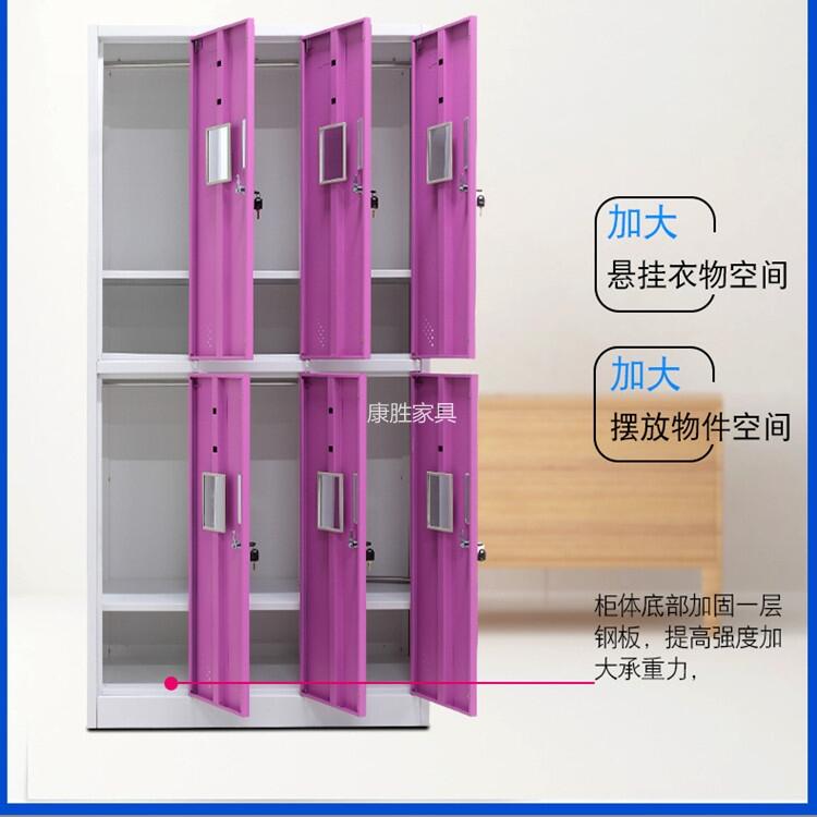 康胜家具生产的六门钢制更衣柜具有、防火、防腐且耐磨、其表面粉末更是无毒、无味、经过欧盟ROHS标准执行、色泽鲜艳、颜色可以随心选配。制造工艺:钢板经全自动脱脂,纯净水清洗、加温除油磷化、表调、干燥工艺,使宿舍更衣柜防锈能力更强,寿命更长。钣金大型设备,复合模具,专用工具夹,宿舍更衣柜加工过程不落地。零部件一次冲切完成,精度高、通用性强。焊接部分采用高标准熔接焊,表面平整光滑采用全自动喷涂流水线,表面静电粉沫喷塑(手工与自动线喷涂相结合,涂层均匀,附着能力强)采用符合欧盟ROHS标准的粉沫使产品真正的环保无毒害。