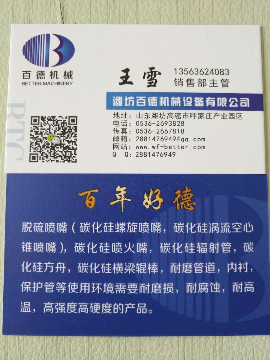 潍坊百德机械设备有限公司拥有先进的生产设备及完善的工艺流程,致力于碳化硅陶瓷与新型超硬材料特种陶瓷的研发创新,产品涵盖窑炉窑具、高温热处理、脱硫、汽车、化工、电子、航天航空等领域。 主营产品: 辐射管、热点偶保护管、冷风管、横梁、辊棒、脱硫喷嘴、燃烧器喷火嘴、喷砂嘴、各种窑具、匣体、坩埚、衬套、密封件及各种耐高温、耐磨损、耐腐蚀的碳化硅异型件等,产品质量已达到欧洲同行业标准,产品远销世界各地。
