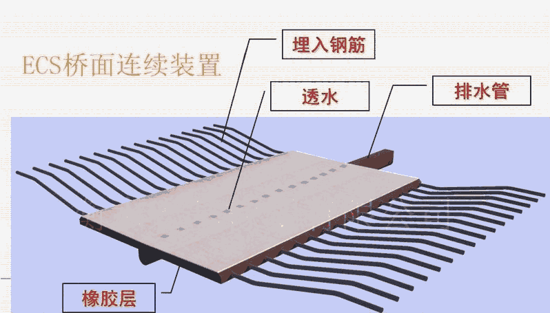 ECS桥面连续装置是什么特殊性能高弹性材料和钢筋的结合体,采用一次压模成型,是用于简支桥梁上部结构桥面连续处的专用装置。