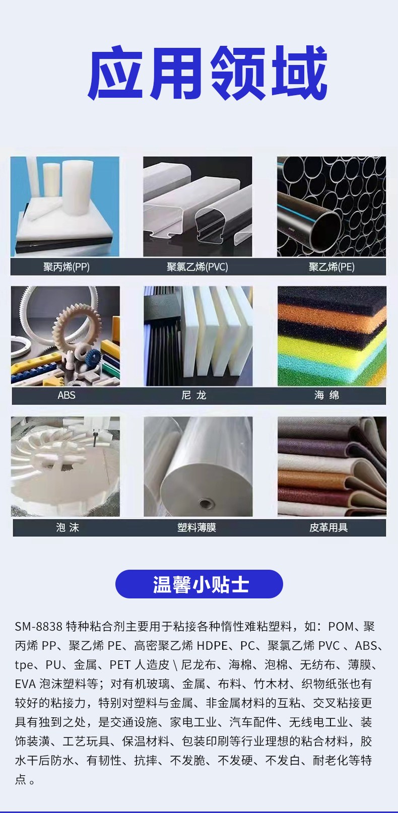 | 用途范围 : | 聚甲醛POM赛钢,特钢 聚乙烯(PE),聚丙烯(PP),聚氯乙烯(PVC),PC(聚碳酸酯),TPE | 分类 : | 慢干特种粘合剂 |