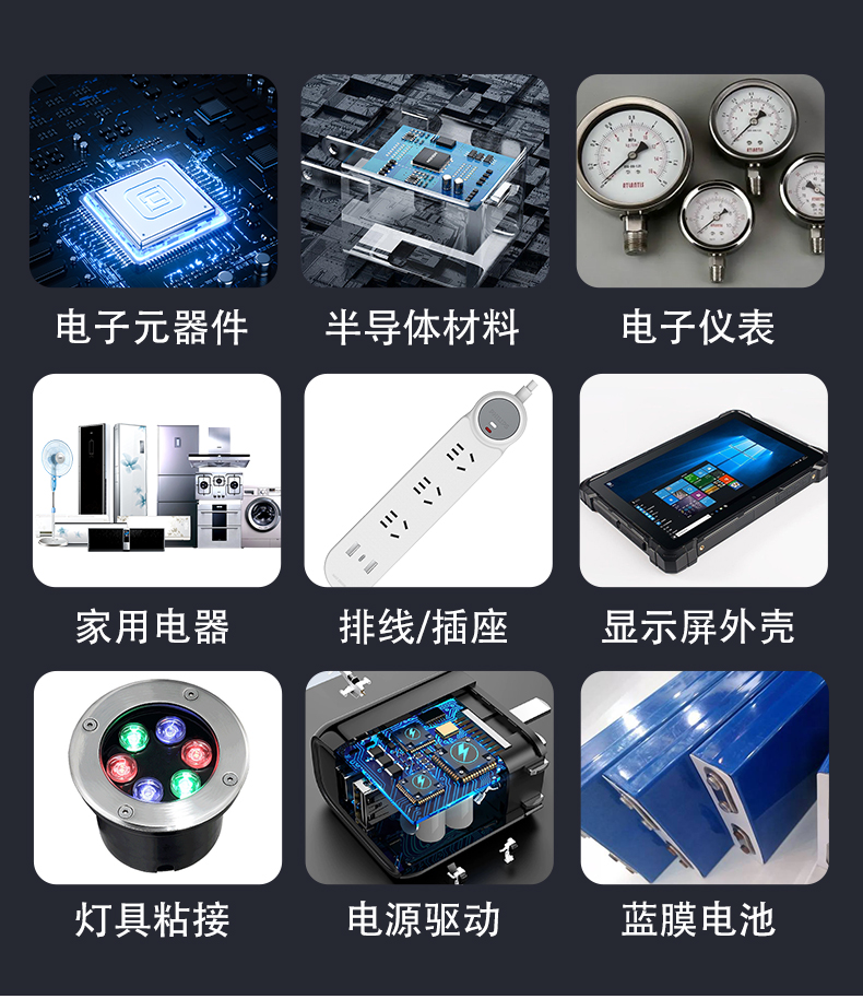 用途范围各类电子元器件、仪表、机械、石材的粘接、密封和涂敷。