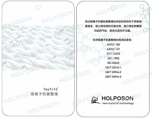 HOLPOSON® AG+主要应用于家纺、服装、墙布、窗帘、地毯、军工等纺织品面料后整理加工工艺,整理抗菌后的纺织品能有效抑制细菌在纺织品表面滋生,破坏微生物的代谢过程,减少微生物繁殖引起的气味,使纺织品具有抗菌防护功能,防止织物产生霉斑,提高纺织品的使用周期。