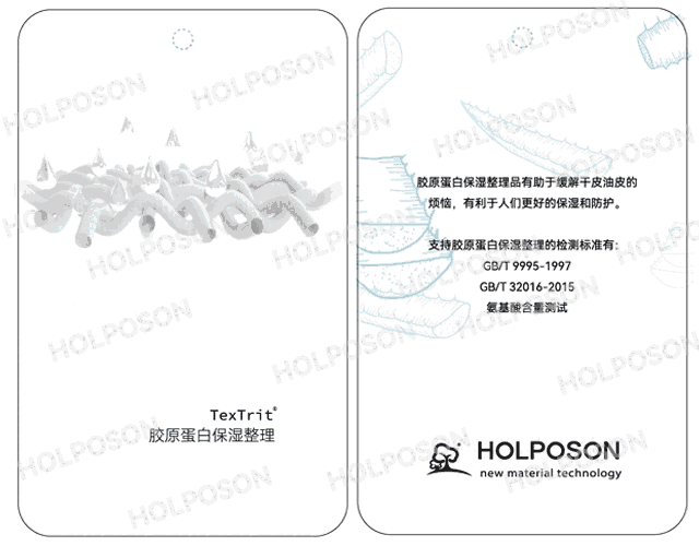 胶原蛋白整理剂HOLPOSON® Xiao Qiao中含有的多种氨基酸活性成分与人体的皮肤蛋白中的氨基酸相似,经其整理后纺织品具有持久的保湿功能。经过胶原蛋白整理后的面料手感爽滑光泽度好,透气速干,对纺织品的含水量保湿率都能有很好的改善作用。