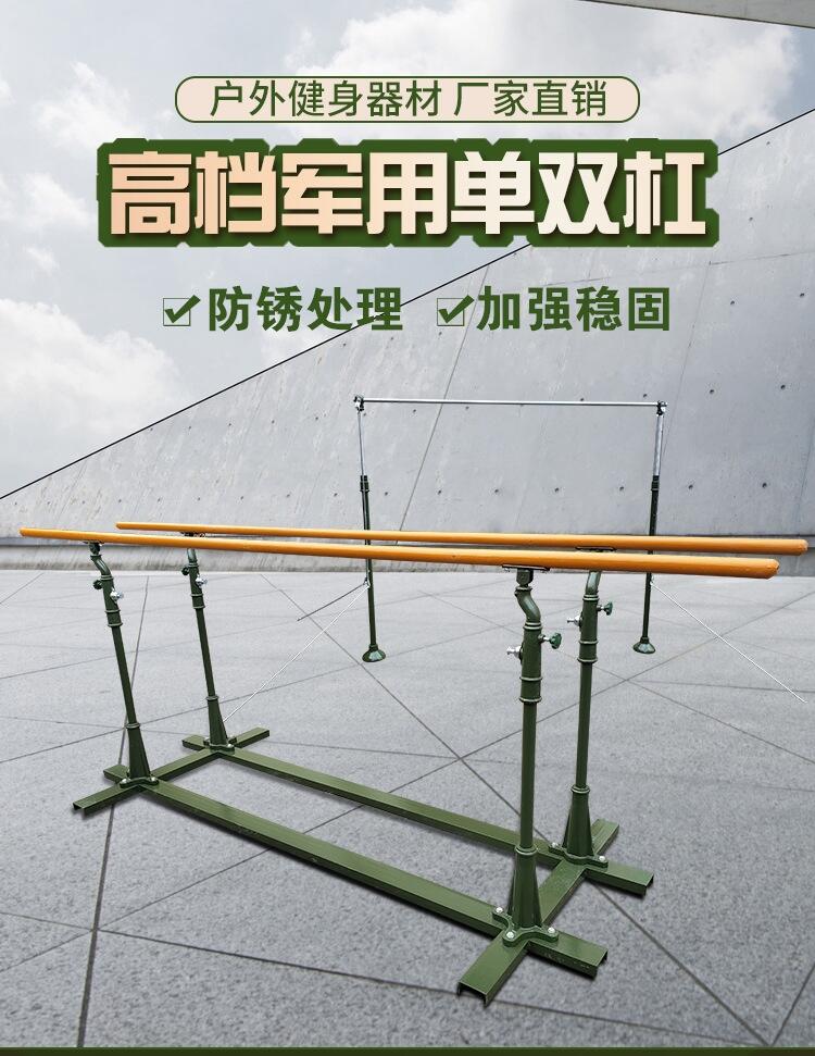 军训双杠:由尼龙双杠面 ,双杠立柱 和槽钢底座三部分组成。