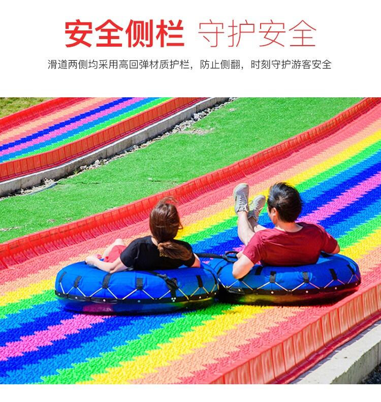 7、性好:七彩滑道也就是旱雪滑道,旱雪滑道的意思就是不去滑雪场就能感受和滑雪场一样的体验,七彩滑道表面是光滑的,坐在上面向下滑需要有雪圈才可以,雪圈是比较柔软的同时它的速度可以控制,坐在上面降低我们的重心,可以我们摔倒.