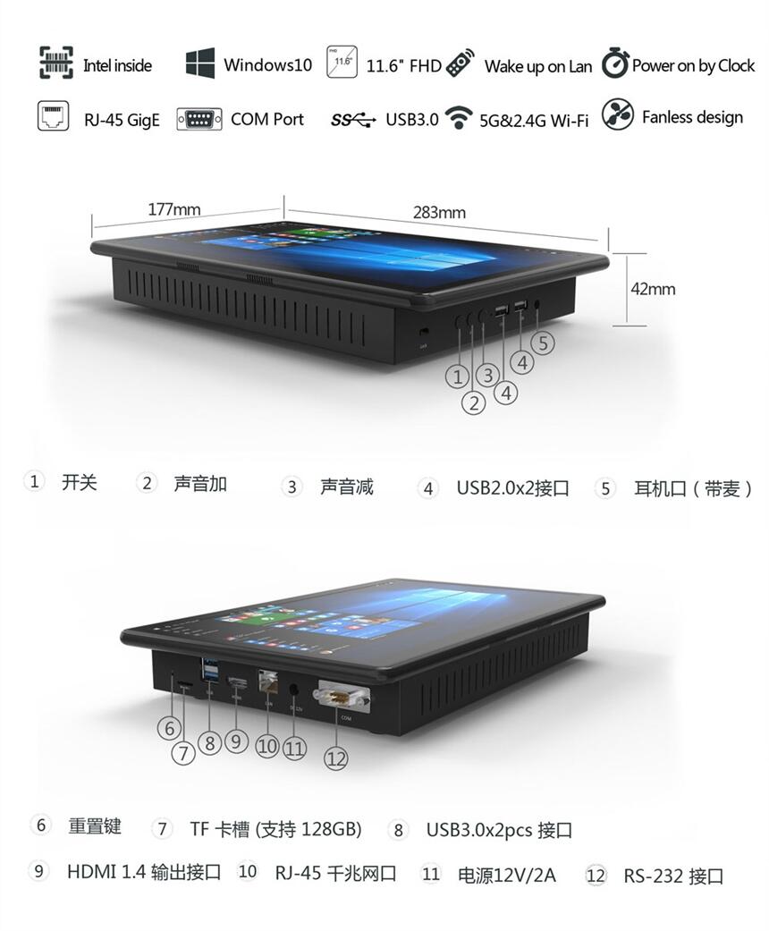前海高乐11.6寸工业触控平板电脑采用11.6寸1920x1080(FHD)高清显示大屏,自带1个RS-232、2个USB3.0、2个USB2.0、1个HDMI高清接口、1个RJ-45千兆网口等丰富接口,可拓展外部功能。支持时钟定时开机、网络远程唤醒,凭借其优异性能特点,可普遍适用于实验室、教育、3D打印、工业制造、智能家居等领域。