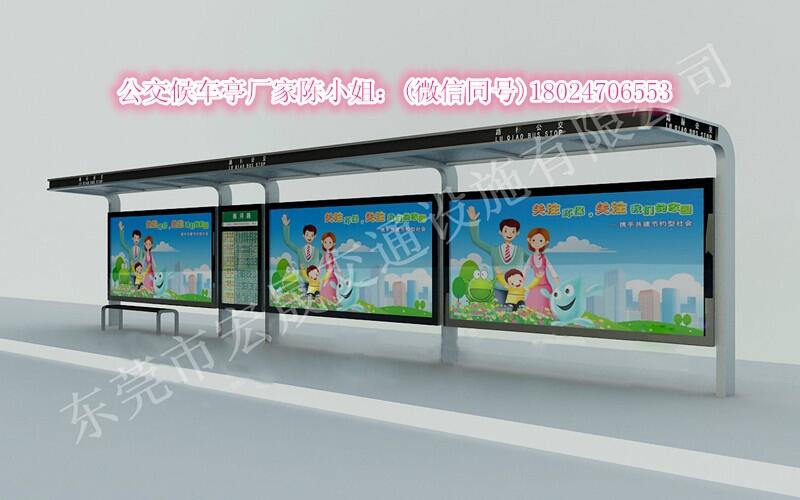 公交车站候车亭,主体镀钢或不锈钢结构,灯箱部分采用镀锌钢、不锈钢或者铝型材质,视窗面板采用钢化玻璃,灯箱内置LED灯、时控漏保、液压撑杆、合页及专用灯箱锁具,表面采用氟碳金属烤漆工艺。具有外形美观、表面耐腐、抗风性能强、使用寿命长等优点。