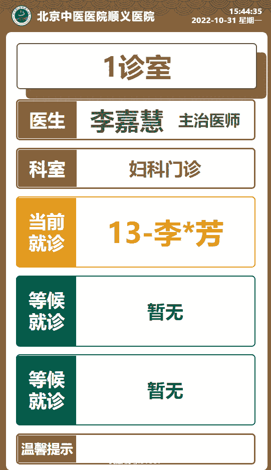 分诊小屏:科室外壁挂式分诊屏,可看到医生姓名、科室介绍及当前就诊和等候就诊患者名称。通过语音功放和显示提醒患者进诊室内就诊。