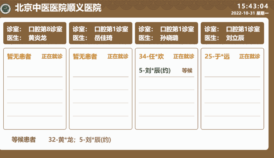 分诊大屏:候诊区分诊大屏可显示多个诊室内就诊情况,使患者能快递到达需要就诊的诊室,当前就诊与准备就诊患者姓名用不同颜色区分开,达到视觉效果。