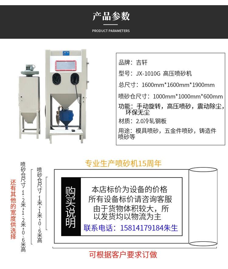 2.要看产品的形状,选择喷砂机的规格,一般一米以下的都有固定的规格,特别大的要订做或选择开放式的。