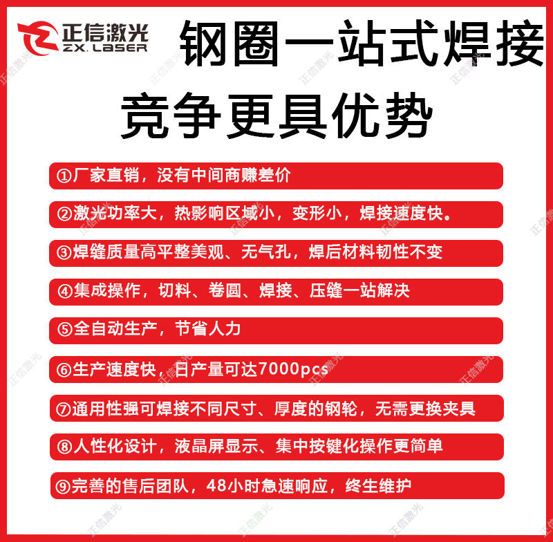 该设备针对轮毂行业全新研发,全自动焊接钢圈,一站式解决钢圈生产的全部环节。采用激光焊接技术,焊缝牢靠稳固不漏气。